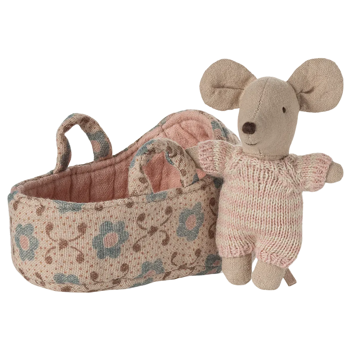 A small baby mouse in a soft and striped knitted suit. It sleeps for hours in its little quilted carry cot.