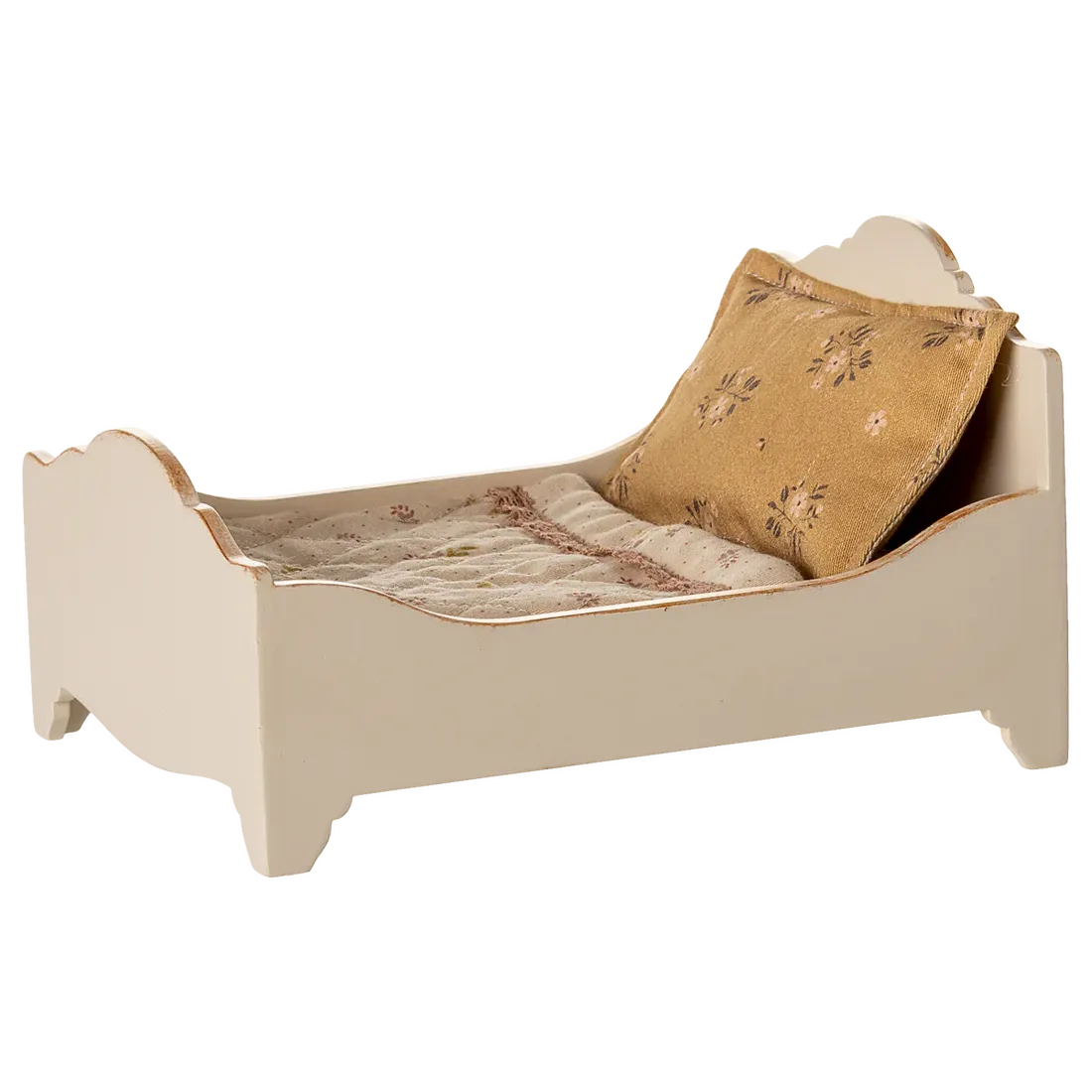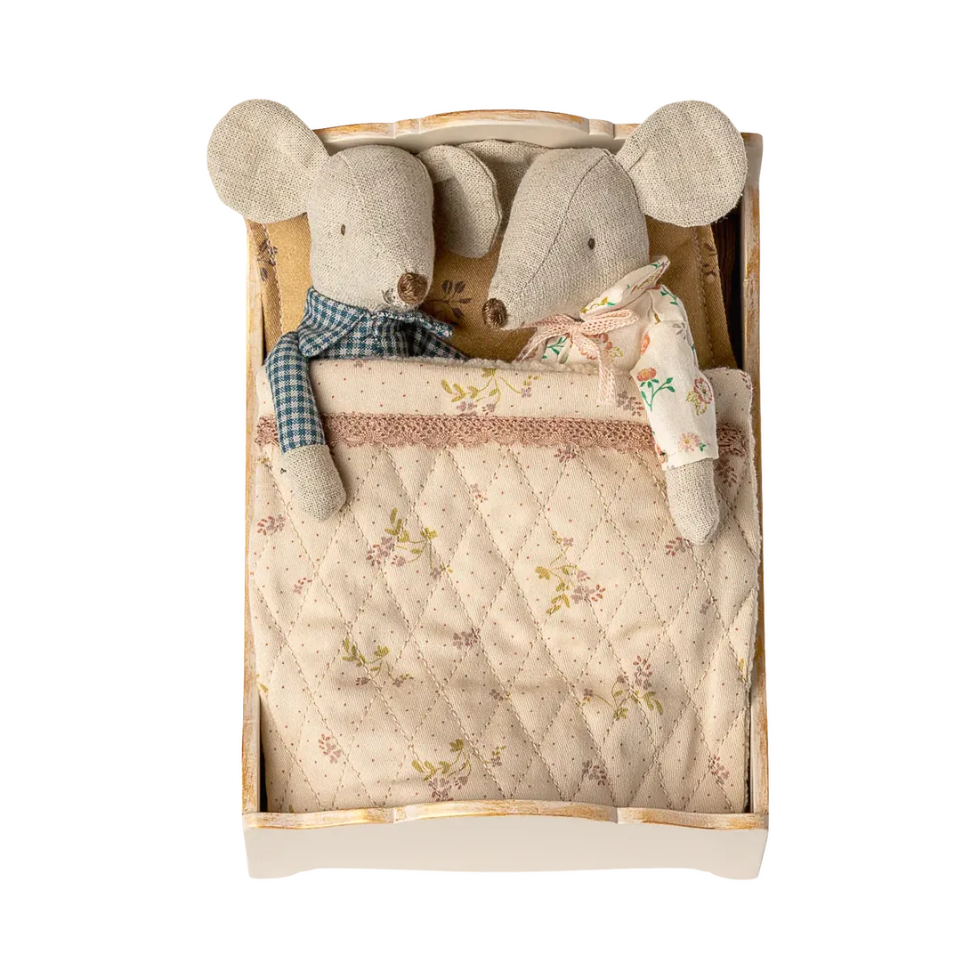 The perfect bed for a good nights sleep. This bed has beautiful small details such as golden finish on the wood and beautiful collected fabrics for bedlinen. Two mice can easily sleep side by side as it fits big sister/brother mice.