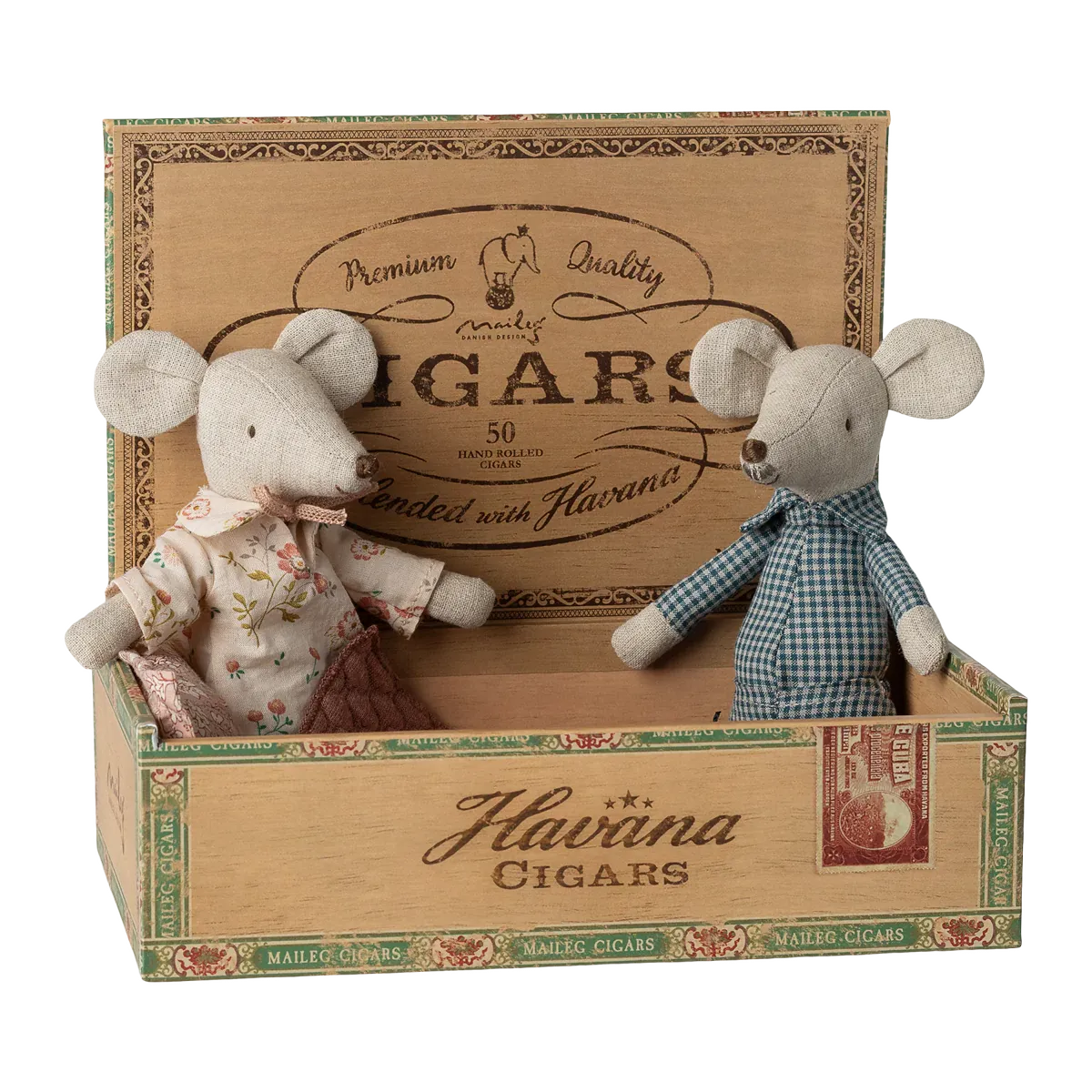 This classic Maileg mouse set features Grandma and Grandpa in their signature nightwear and shoes. The included cigar box serves as a perfect bed for a good night's sleep.
