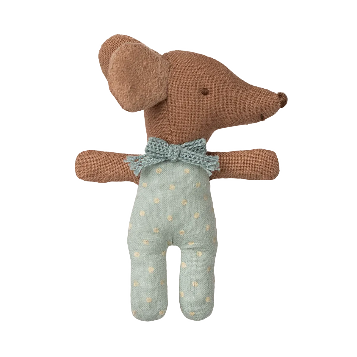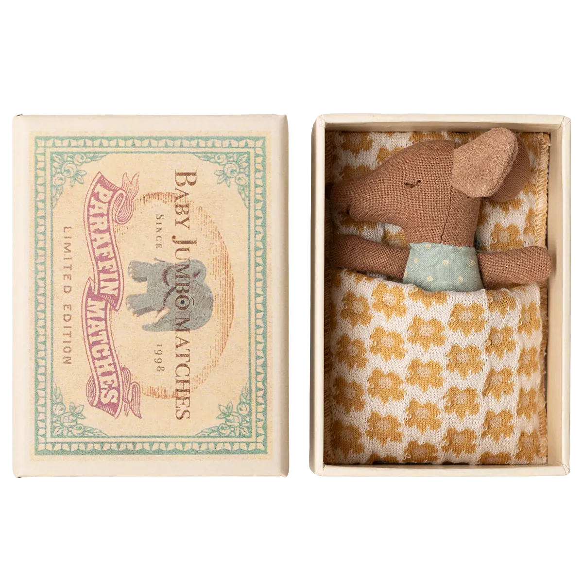 A classic Maileg item. This mouse is ready for hours of play and sleeps tight in the little matchbox. The clothes and bedlinen are made of soft fabrics with unique prints in beautiful colors.