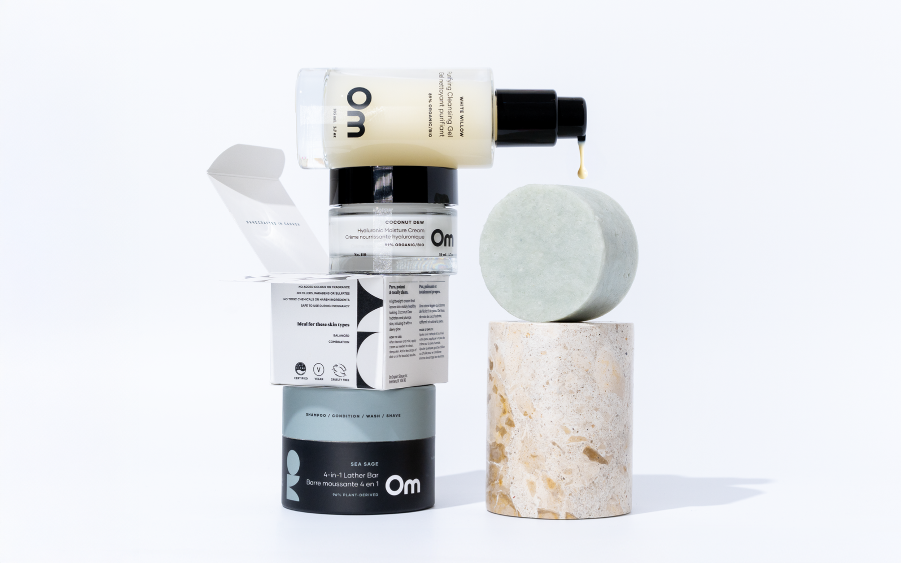 Meet your everyday essentials for clean, balanced, deeply hydrated skin and hair. This gentle yet effective trio purifies without stripping and delivers lasting, feather-light moisture for a calm, supple glow. Featuring our most neutral, skin-friendly formulas — perfect for every body and every routine. INCLUDES – White Willow Purifying Cleansing Gel (105 ml) – Sea Sage 4-in-1 Lather Bar – Coconut Dew Hyaluronic Moisture Cream (50 ml)